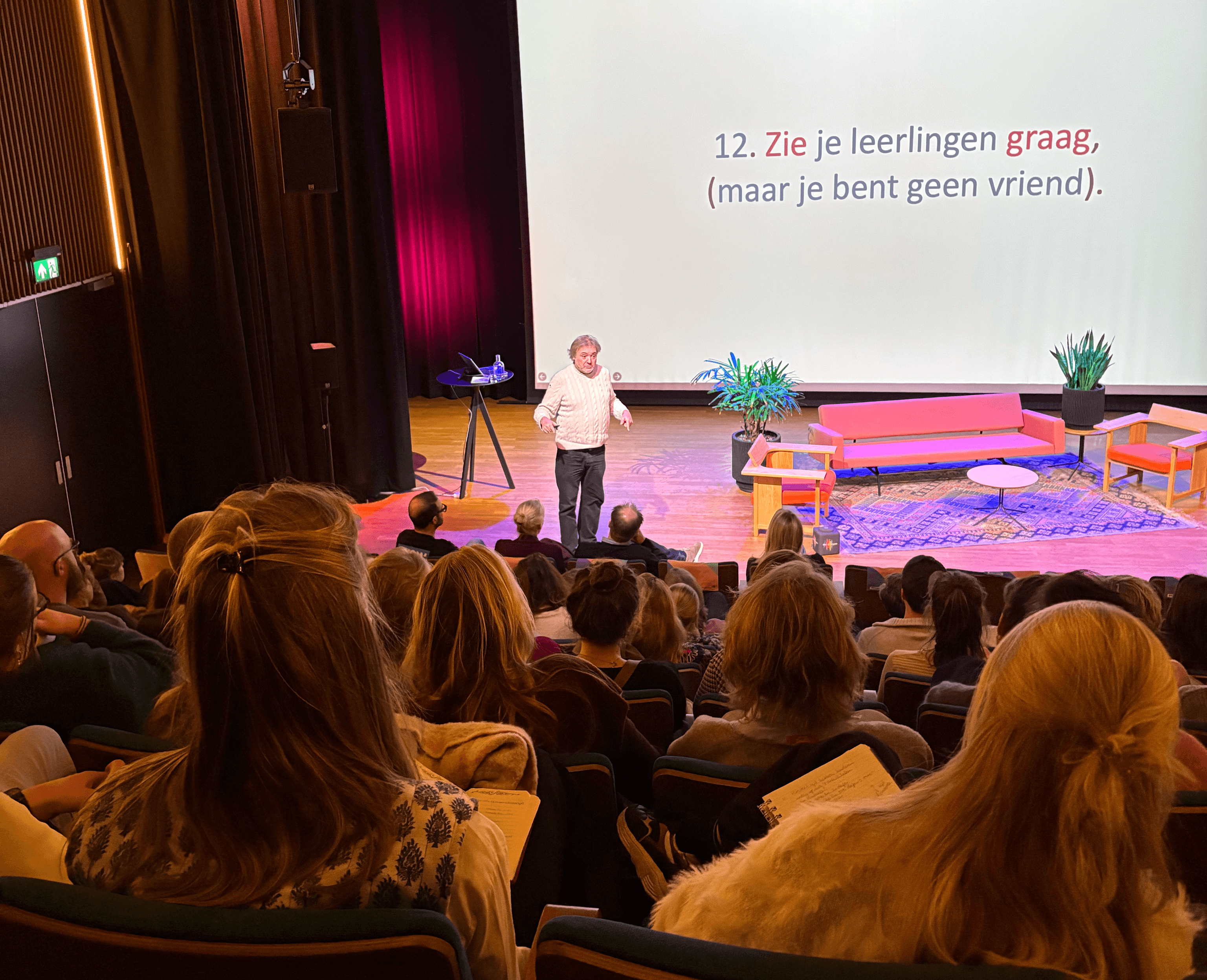 “Wie weet op welke leeftijd een kind bewust het verschil tussen 5 en 10 kan herkennen?” Met die vraag opende De Bruyckere het Onderwijscafé. Na een paar voorzichtige gokjes uit de zaal kwam het verrassende, bijna schokkende antwoord: vijf maanden. Hij lichtte het onderzoek achter deze bevinding toe en benadrukte dat kinderen vaak veel meer kunnen dan traditionele theorieën lang hebben aangenomen. Wat erop neerkomt dat we onze leerlingen vaak onderschatten. Hier rekening mee houden heeft een positief effect op het leerproces, aldus De Bruyckere.